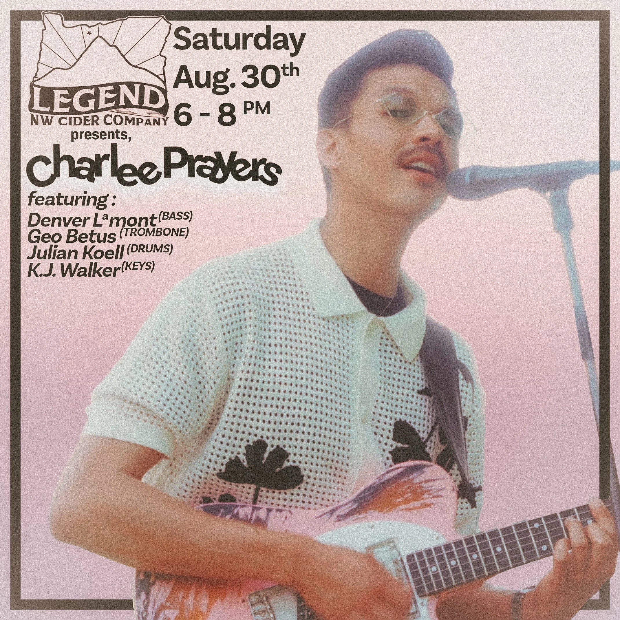 Back to All Events Charlee Prayers (w/ full band) @ Legend Cider (Talent OR) Saturday, August 30, 2025 6:00 PM 8:00 PM Legend Cider 245 West Valley View Road Talent, OR, 97540 United States (map) Google Calendar ICS Bringing out all the heavy hitters to Legend Cider in Talent. Come on down and grab a refreshing bevy, support a food truck and your favorite rogue valley musicians!